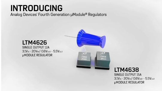 LTM4626 및 LTM4638 강압 μModule 레귤레이터는 완벽한 강압 DC-DC 스위칭 모드 전력 레귤레이터로서, 초소형 6.25mm x 6.25mm BGA(Ball Grid Array) 패키지로 제공된다. μModule(microModule) 패키지에는 스위칭 컨트롤러, 전력 FET, 인덕터 및 지원 구성 요소가 포함되어 있다. 3.1~20.0V의 입력 전압 범위에서 작동하는 LTM4626 및 LTM4638은 하나의 외부 레지스터로 설정된 0.6~5.5V의 출력 전압 범위를 지원한다. 이 장치는 최대 12A(LTM4626) 및 15A(LTM4638)의 연속 출력 전류를 제공한다. 벌크 입력 및 출력 커패시터만 필요하다.
